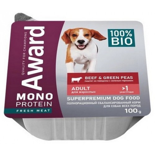 Влажный корм AWARD Monoprotein для взрослых собак паштет из говядины с зеленым горошком 100г.