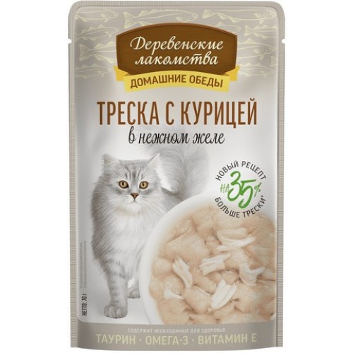 Деревенские лакомства влажный корм для кошек Треска с курицей в нежном желе 70г.