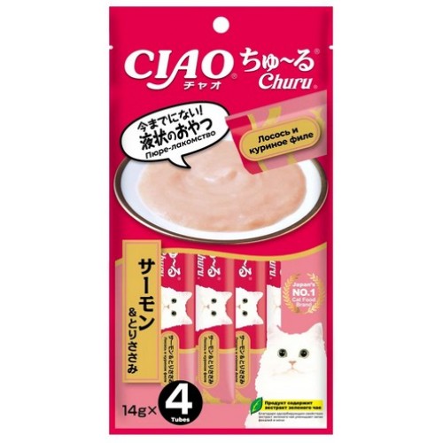 INABA CIAO Churu (ИНАБА ЧАО ЧУРУ) пюре-лакомства для кошек на основе лосося и куриного филе.